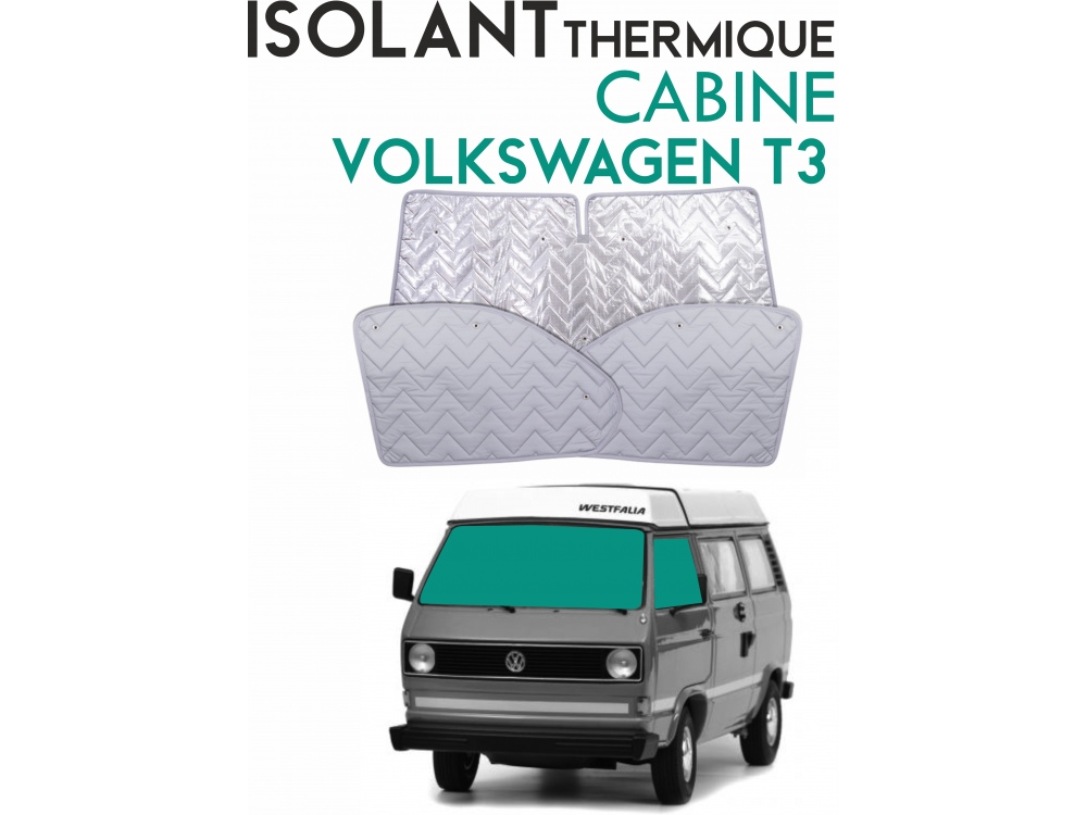 Isolant cabine 3 pièces Volkswagen T3 (1979-1990). Kit thermique alu 9 couches, pare-brise + vitres latérales, fixation ventouses.