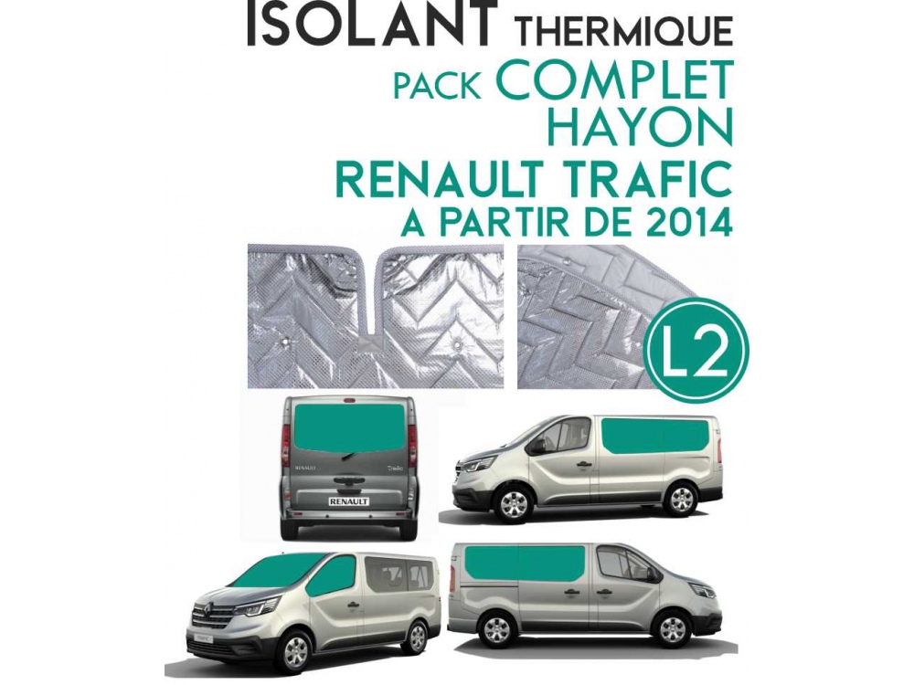 Kit isolant thermique et occultant 8 pièces pour Renault Trafic L2H1 (2014→) avec hayon. Aluminium 7 couches, ventouses incluses, protection contre condensation et occultation totale.