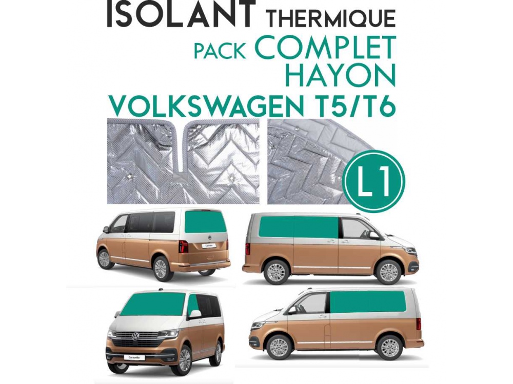 Kit isolant thermique et occultant 8 pièces pour Volkswagen Transporter T5/T6 L1H1 avec hayon. Isolation aluminium 7 couches, ventouses incluses, occultation totale.