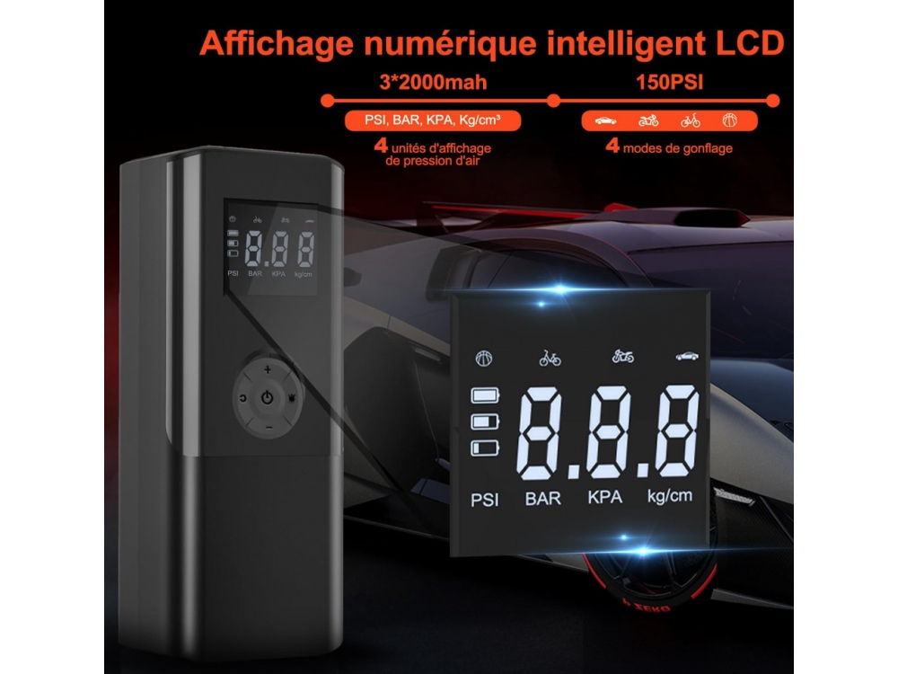 Mini Compresseur d’Air Portatif permettant de regonfler rapidement les pneus de votre véhicule ou tout autres équipements embarqués tel: Vélo, paddle, kayak...