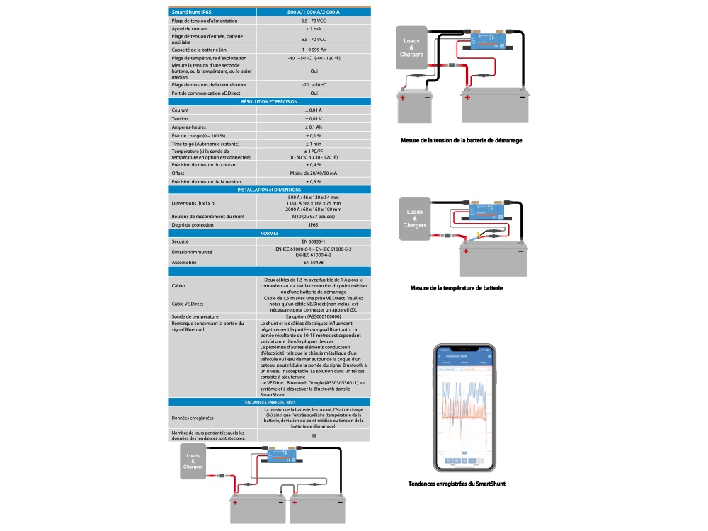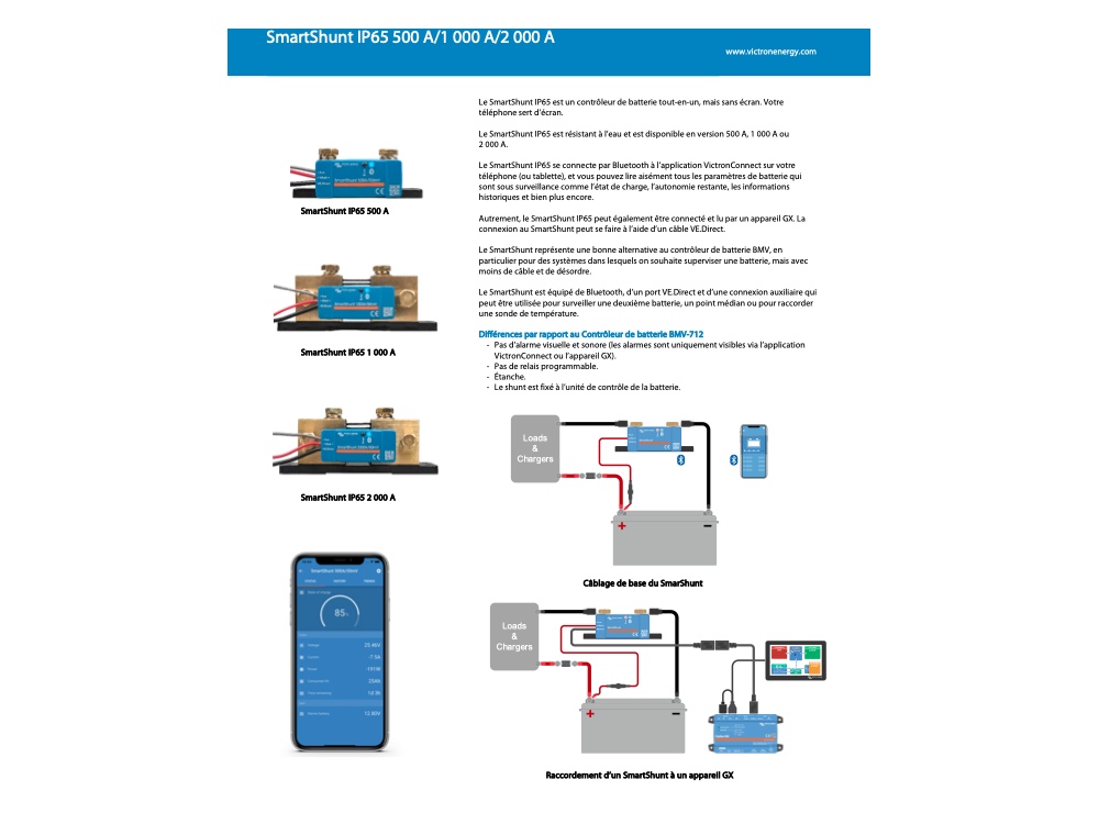 Le SmartShunt est un contrôleur de batterie tout-en-un, mais sans écran. Le SmartShunt se connecte par Bluetooth à l'application VictronConnect sur votre téléphone et vous pouvez lire aisément tous les paramètres de batterie.