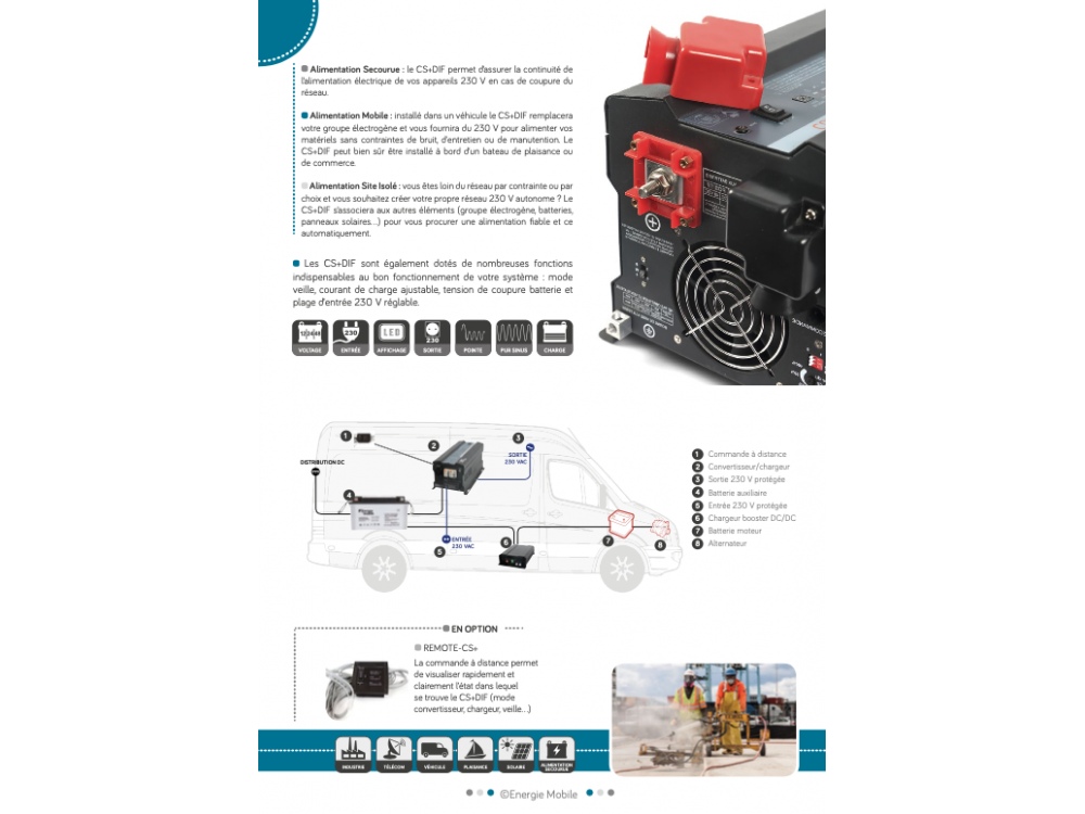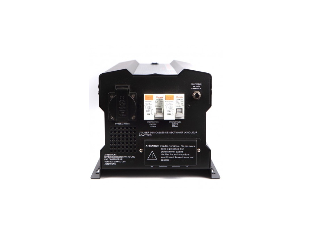 Le basculement entre le mode convertisseur et chargeur est entièrement automatique et ne nécessite aucune manipulation de l’utilisateur. La puissance maximale instantanée permet d’alimenter des moteurs ou autres consommateurs ayant un appel de courant important au démarrage. Les branchements peuvent s'effectuer sur bornier ou sur prise intégrée. La sortie 230V est protégée par un interrupteur différentiel.