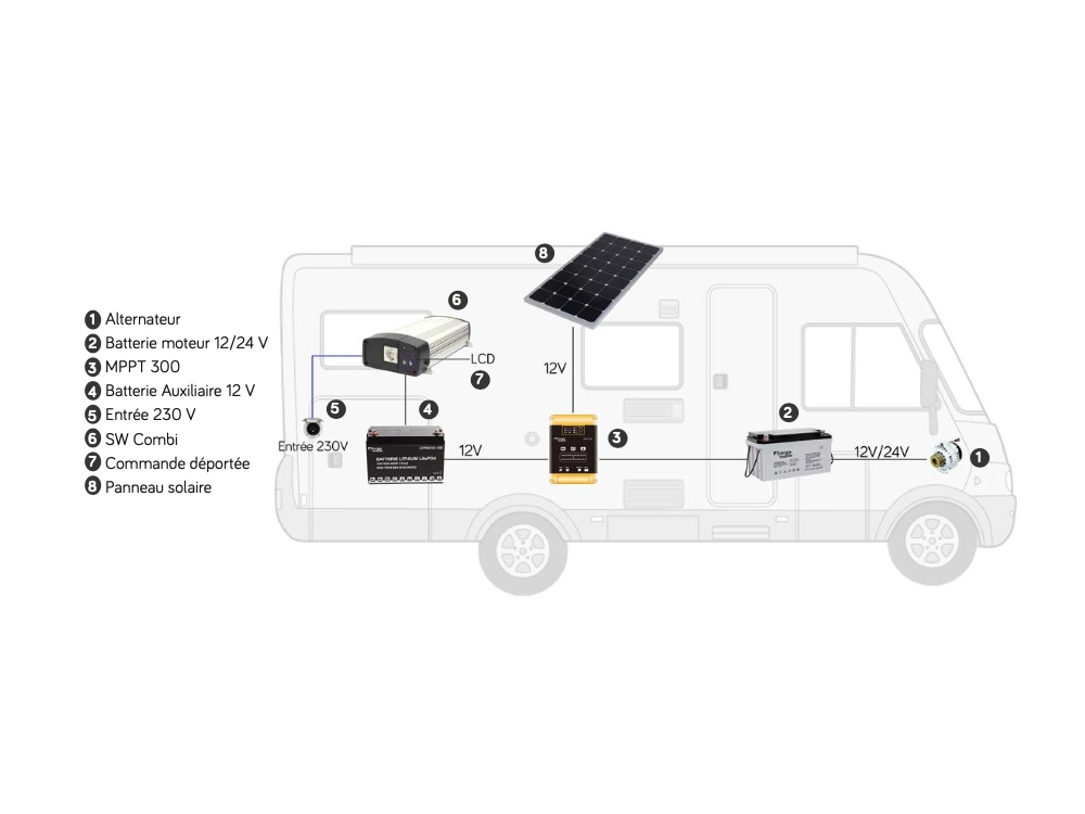 Le convertisseur fournit une tension sinusoïdale pure parfaitement compatible avec tous les appareils ; la puissance maximale instantanée permet d'absorber des puissances de crête temporaires. Possibilité de branchements sur bornier ou sur prise intégrée.