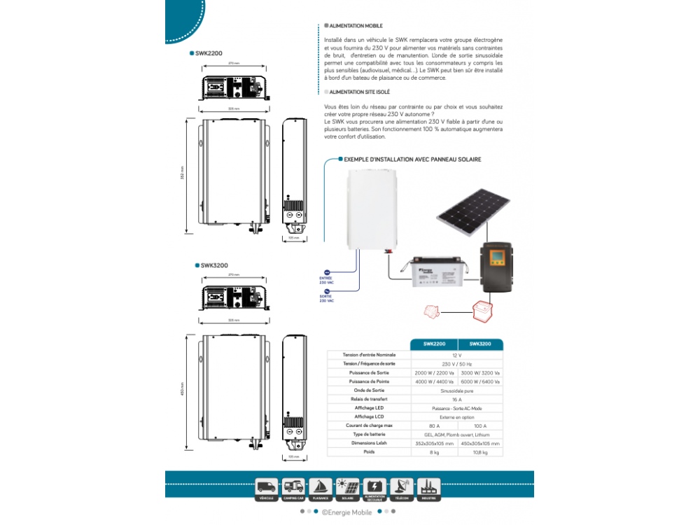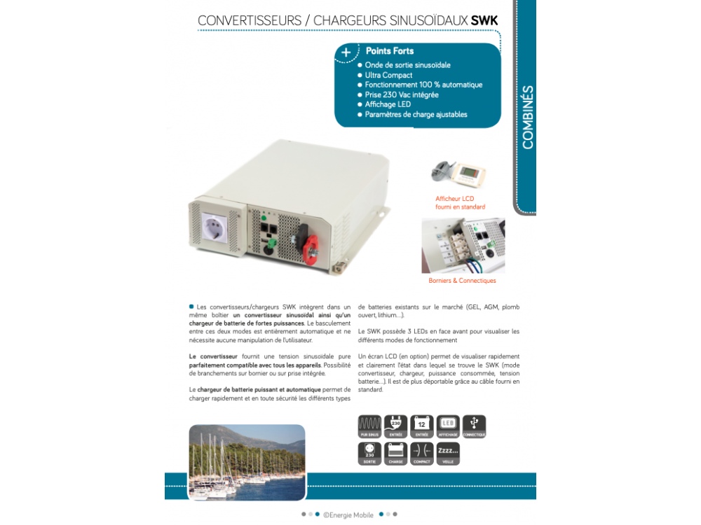 Le convertisseur/chargeur SWKCOMBI3200 intègre dans un même boitier un convertisseur sinusoïdal ainsi qu'un chargeur de batterie évolué. Le basculement entre ces deux modes est automatique et ne nécessite aucune manipulation de l'utilisateur.