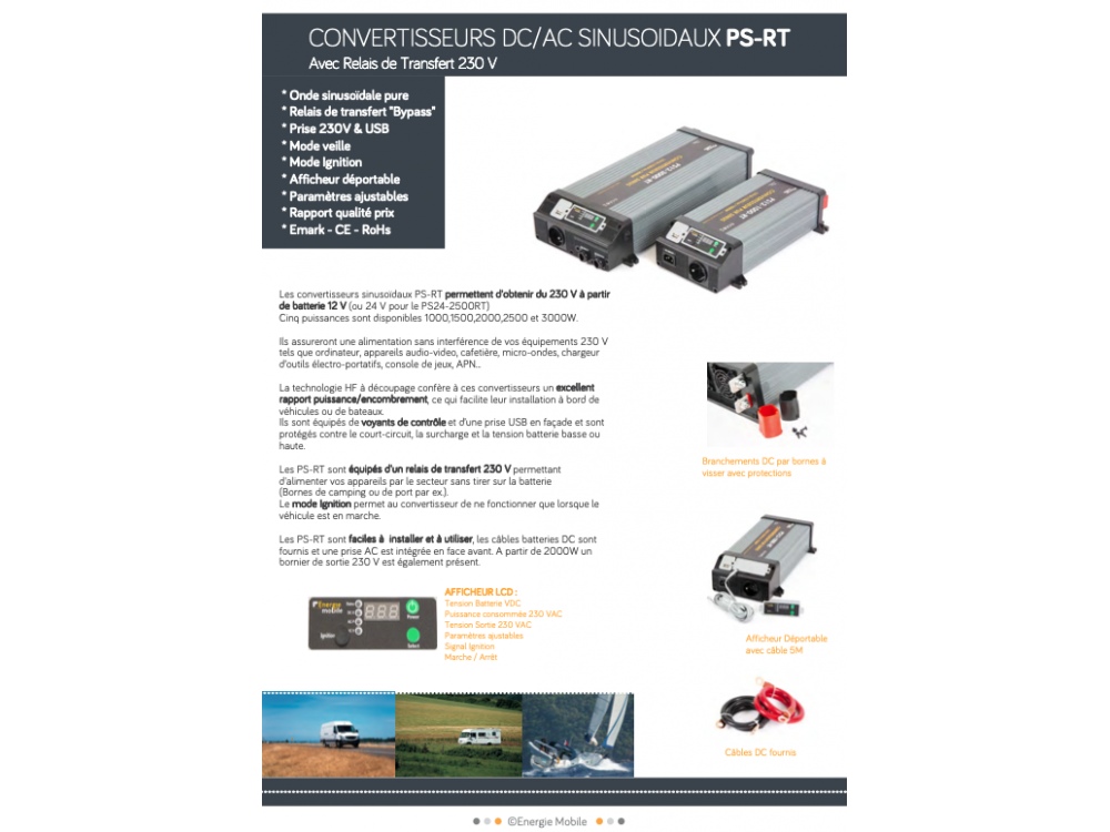 Le convertisseur sinusoïdal PS 12-2500-RT permet d'obtenir du 230 V à partir de batterie 12 V. Il assure une alimentation sans interférence de vos équipements 230 V tels que ordinateur, cafetière, micro-ondes, console de jeux...
