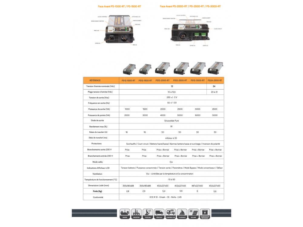 La technologie HF à découpage confère à ces convertisseurs un excellent rapport puissance/encombrement, ce qui facilite son installation à bord de véhicules ou de bateaux.