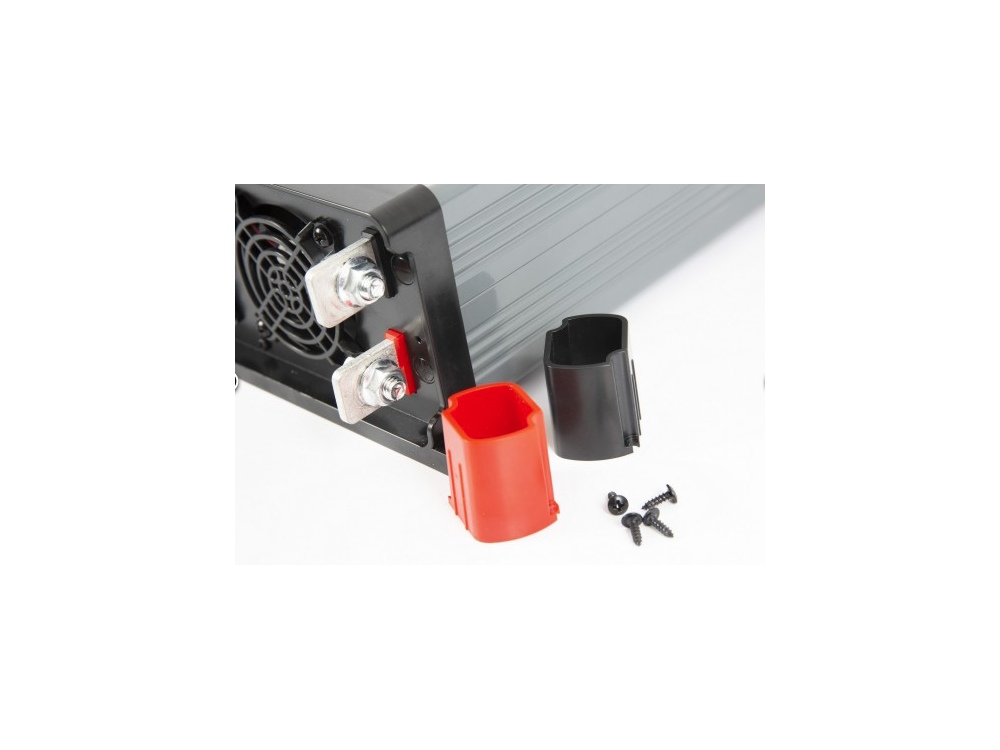 Le PS 12-2500-RT est facile à installer et à utiliser, les câbles batteries DC sont fournis et une prise AC est intégrée en face avant. A partir de 2000W un bornier de sortie 230 V est également présent.