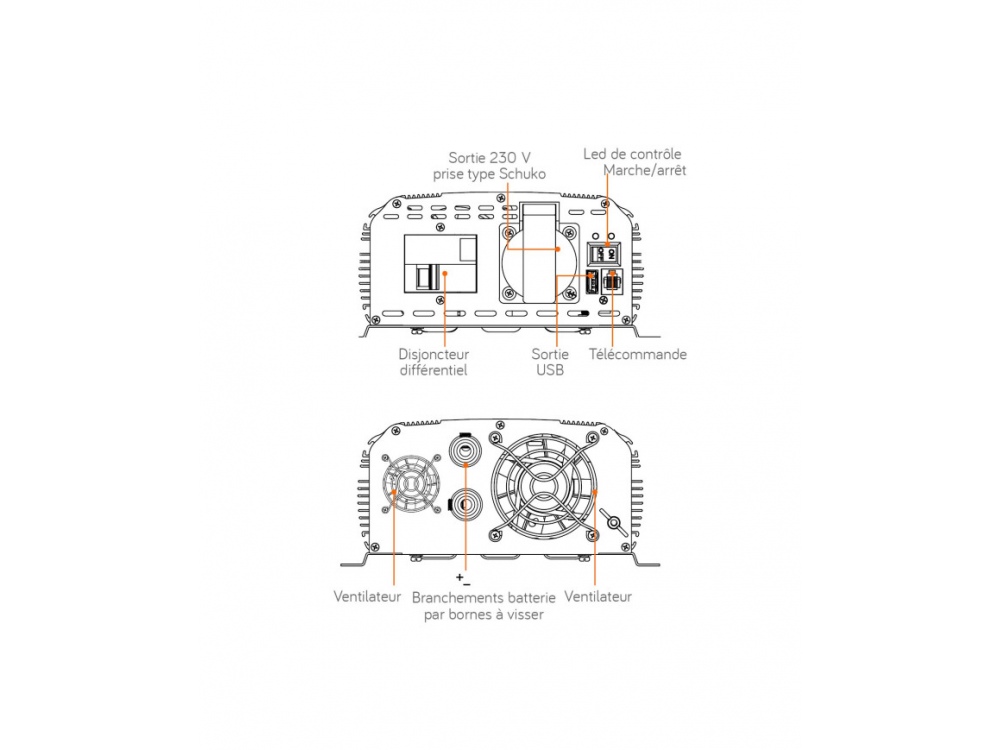 Il est équipé de voyants de contrôle et d’une prise USB en façade et est protégé contre les courts-circuits, surcharge et tension batterie basse ou haute.