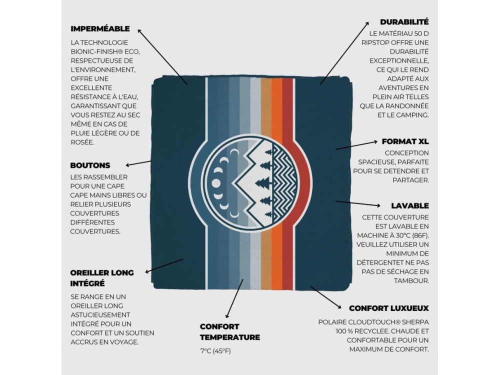 - La couverture Queen Cloudtouch® est fabriquée à partir de matériaux 100 % recyclés, avec une polaire sherpa Cloudtouch® pour plus de chaleur et de douceur, et du Ripstop REPREVE® 50D pour une durabilité et une protection optimales contre les intempéries.