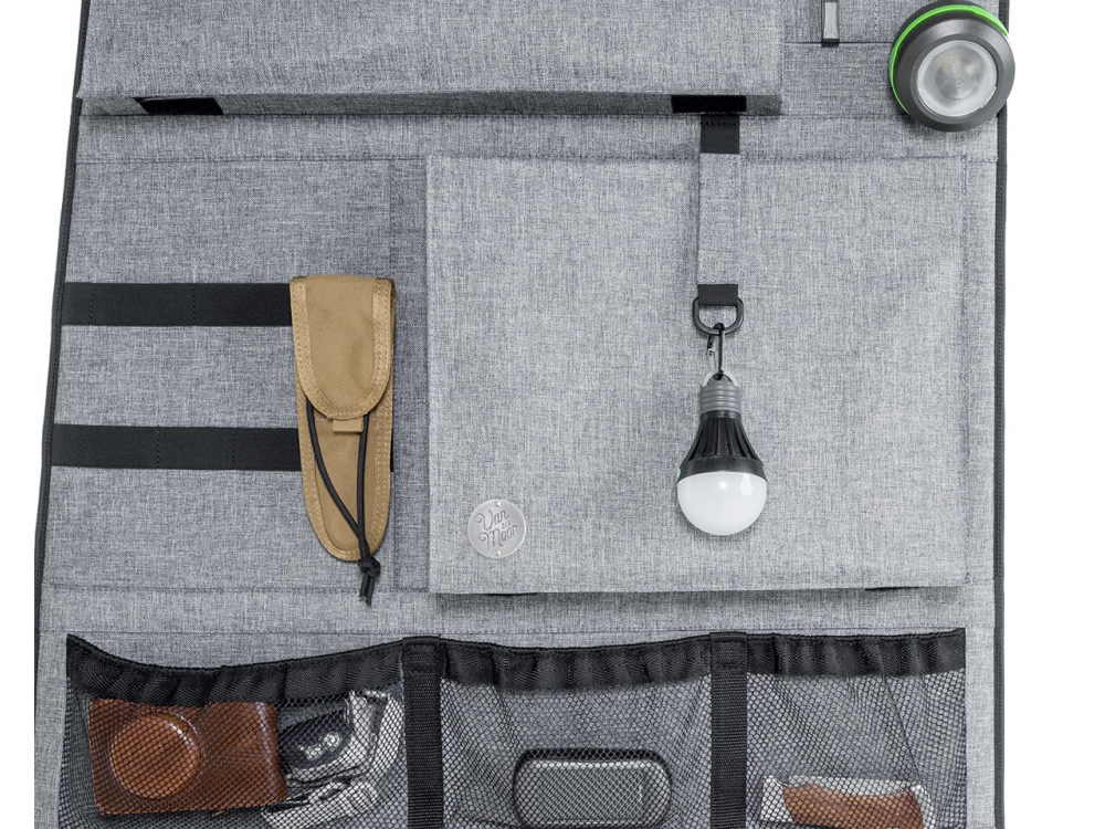 - Une multitude de poches, de filets, de crochets et d’élastiques permettent de tout avoir toujours à portée de main (et à sa place).