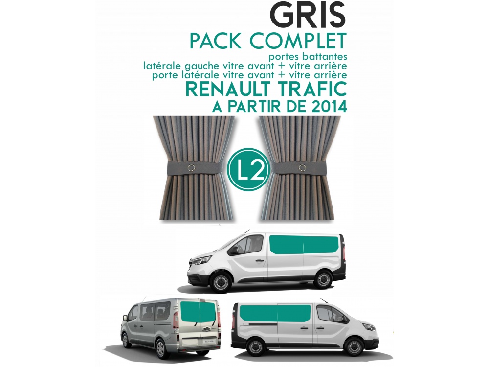 Rideaux occultant sur rail. De couleur gris. Pour RENAULT TRAFIC à partir de 2014 châssis long (L2). PACK COMPLET 6 rideaux. Pack pour véhicule avec portes battantes. INSTALLATION FACILE.