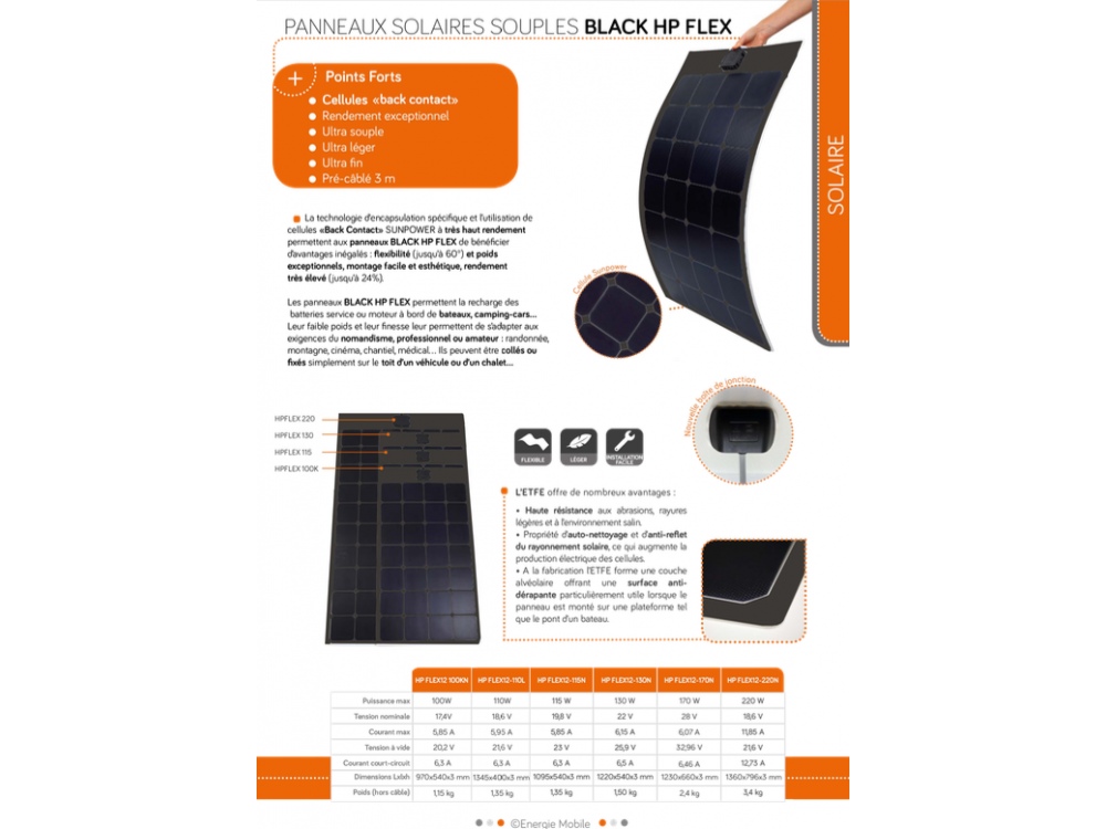 Caractéristiques générales du panneau solaire 12V extra souple ENERGIE MOBILE HPFLEX110N :