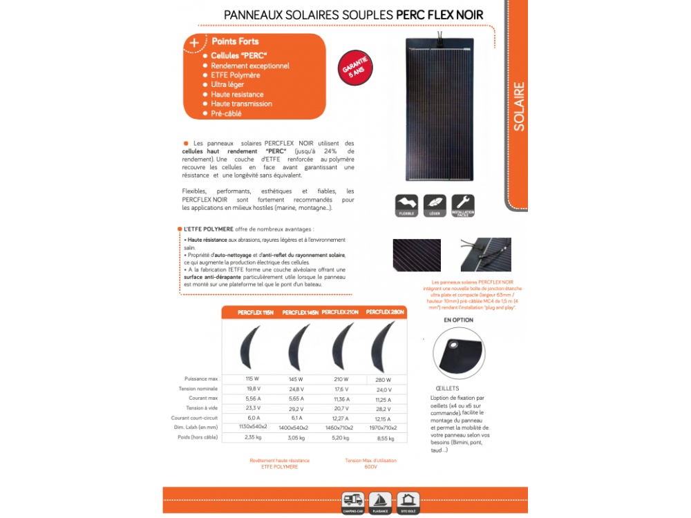 Caractéristiques générales du panneau solaire extra souple ENERGIE MOBILE PERCFLEX145N :