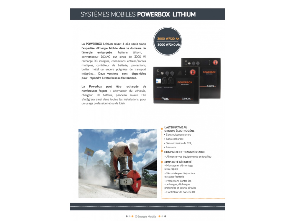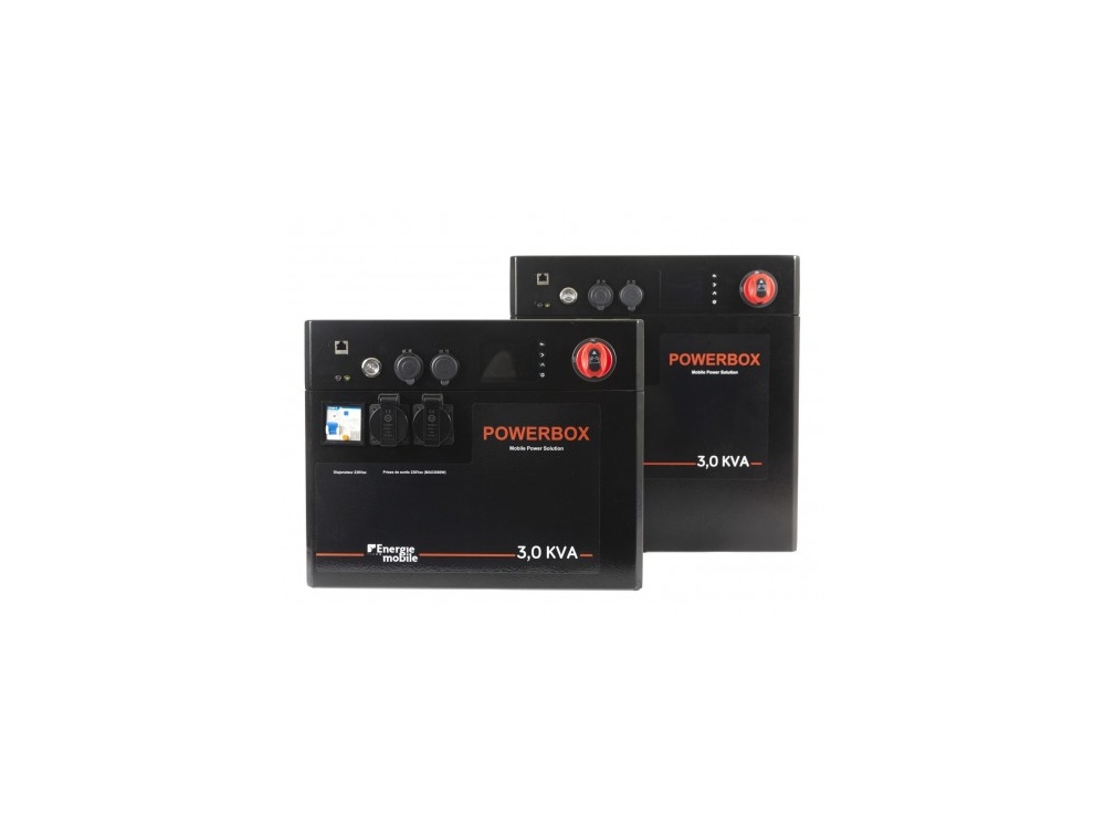 La POWERBOX Lithium réunit à elle seule toute l’expertise d’Energie Mobile dans le domaine de l’énergie embarquée : batterie lithium, convertisseur DC/AC pur sinus de 3000 W, protections ou encore poignées de transport intégrées...