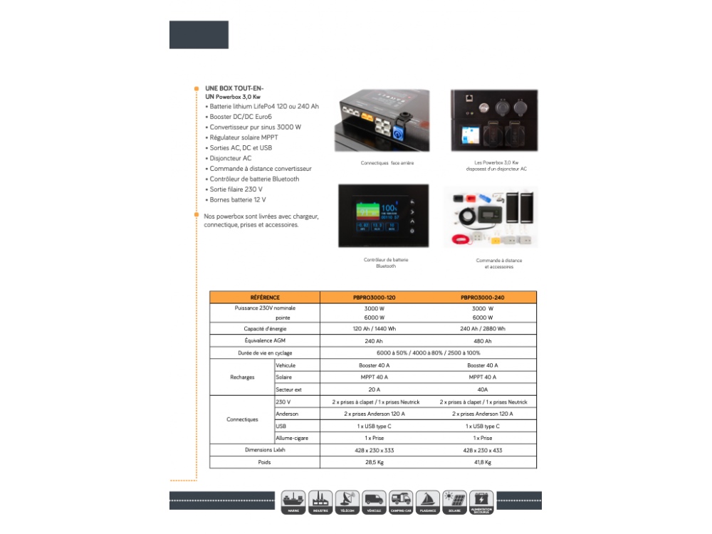 La POWERBOX Lithium réunit à elle seule toute l’expertise d’Energie Mobile dans le domaine de l’énergie embarquée : batterie lithium, convertisseur DC/AC pur sinus de 3000 W, recharge DC intégrée, régulateur solaire MPPT intégrés, connexions entrées/sorties multiples, afficheur LCD, protections, boitier métal ou encore poignées de transport intégrées... Tous ces atouts font du POWERBOX la source d’énergie indispensable à bord de votre véhicule ou de votre bateau.