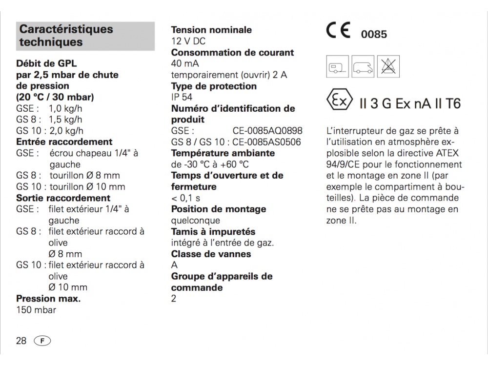 Spécifications techniques de l'interrupteur électronique / vanne de gaz 12 V TRUMA ø 8mm :